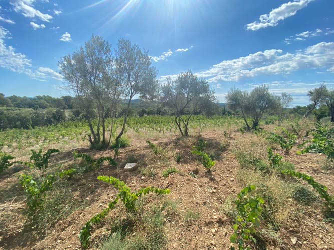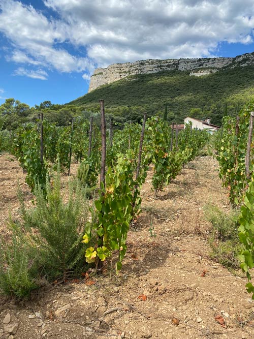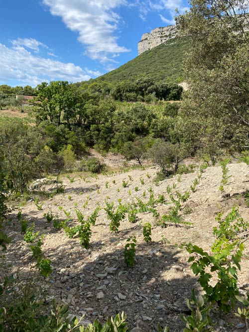 Séduits par la beauté du site, classé Natura 2000, ils décident d’y poser leurs racines. Sans expérience viticole, ils se lancent dans une aventure familiale et artisanale, bâtissant tout depuis zéro. Leur ambition : révéler le potentiel des sols calcaires du Pic Saint-Loup à travers des vins blancs d’altitude.