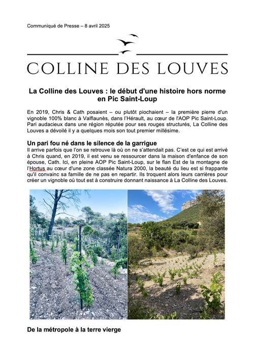 En 2019, Chris et Cath fondent La Colline des Louves à Valflaunès, au cœur du Pic Saint-Loup, en misant sur un vignoble 100 % blanc – une audace dans une terre de rouges.