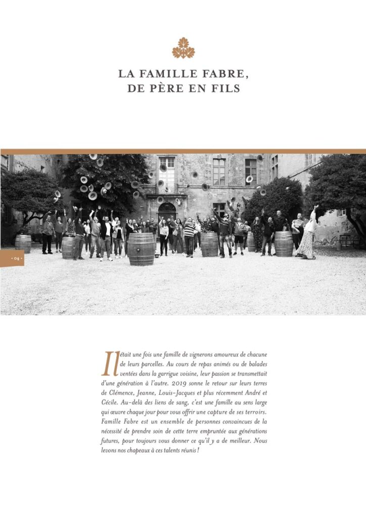 La Famille Fabre se passionne pour le vin depuis plus de 14 générations. Ses fondations sont solides, son savoir-faire précis. Depuis 1605 les vignobles ont évolué par des alliances heureuses en restant toujours proches de la terre et de la vigne, aujourd’hui avec 5 châteaux dans le Languedoc. La Famille Fabre aime l’exigence du métier de vigneron et s’engage quotidiennement à révéler le meilleur de son terroir grâce à un travail de sélection parcellaire et une vraie maîtrise des techniques de culture, de vinification et d’élevage, toujours dans le respect de la Terre.